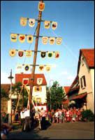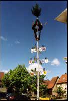 Inzwischen hat sich Einiges geändert. Wegen der Errichtung des Altenpflegeheimes direkt neben dem Gorroner Platz konnte der Maibaum nicht mehr an der seitherigen Stelle aufgerichtet werden. Ein neuer Standort wurde gefunden und von der Gemeinde eine neue sichere Halterung geschaffen. Weil der Baum nun nicht mehr am Rande des Festplatzes steht, hat der Heimatverein die Aufhängung der Embleme so gestaltet, daß diese von allen Seiten aus sichtbar sind. Zusätzlich zu den Vereinsemblemen wurden noch Symbole des Handwerks angebracht. Seit 2005 darf der Maibaum aus haftungsrechtlichen Gründen nicht mehr aufgerichtet werden, wenn sich im Umkreis von 30 Metern Personen befinden. Nachdem ein solcher Abstand bei dem begrenzten Platzangebot nicht frei gehalten werden kann, sieht man sich leider gezwungen, den Maibaum aufzurichten, bevor die Leute zum Fest kommen. Das Maifest ist dadurch um seine eigentliche Attraktion ärmer. Trotzdem werden wir unserer Freude über das Wiedererwachen der Natur bei unserem gemeinsamen Maifest Ausdruck verleihen. |